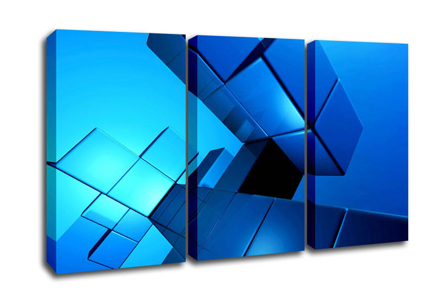 Cylinderical Blue 3 Panel Canvas Print handmade in the UK. Stretched over a 2 inch thick wooden box frame, ready to hang on your wall.