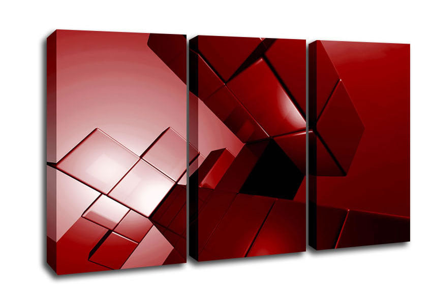 Cylinderical Red 3 Panel Canvas Print handmade in the UK. Stretched over a 2 inch thick wooden box frame, ready to hang on your wall.