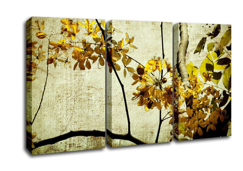The Golden Winter Leaves 3 Panel Canvas Print handmade in the UK. Stretched over a 2 inch thick wooden box frame, ready to hang on your wall.