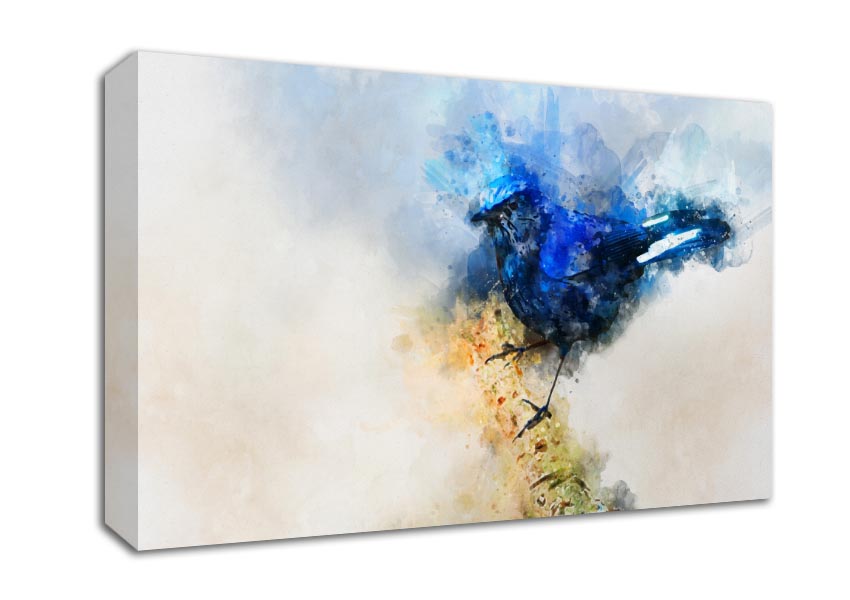 Blue watercolour bird on branch Canvas Print handmade in the UK. Stretched over a 2 inch thick wooden box frame, ready to hang on your wall.