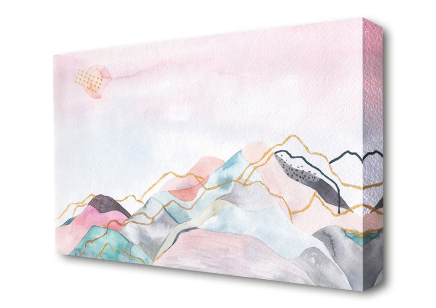 The Pastel Mountain View Canvas Print handmade in the UK. Stretched over a 2 inch thick wooden box frame, ready to hang on your wall.