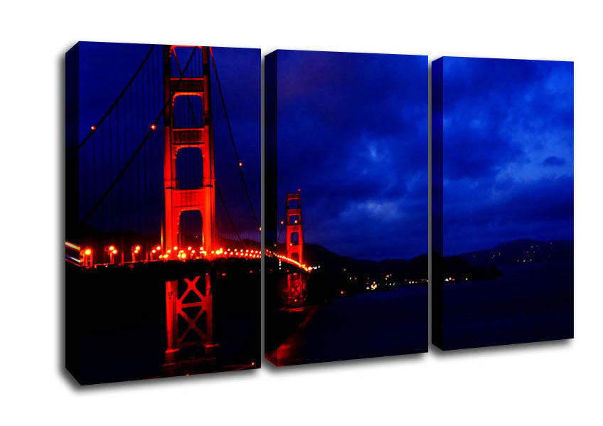 Golden Gate Bridge Red Lights 3 Panel Canvas Print handmade in the UK. Stretched over a 2 inch thick wooden box frame, ready to hang on your wall.