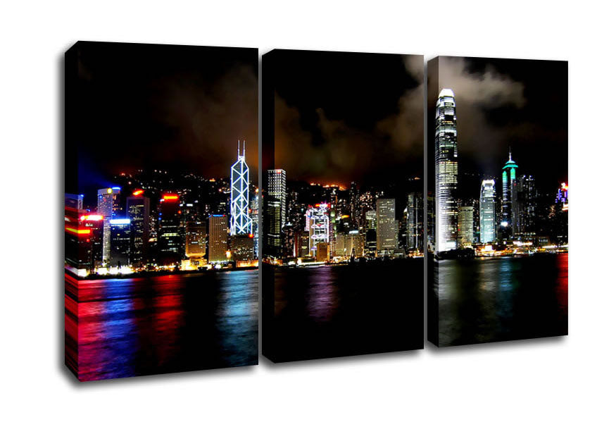 Hong Kong Cloudy Nights 3 Panel Canvas Print handmade in the UK. Stretched over a 2 inch thick wooden box frame, ready to hang on your wall.