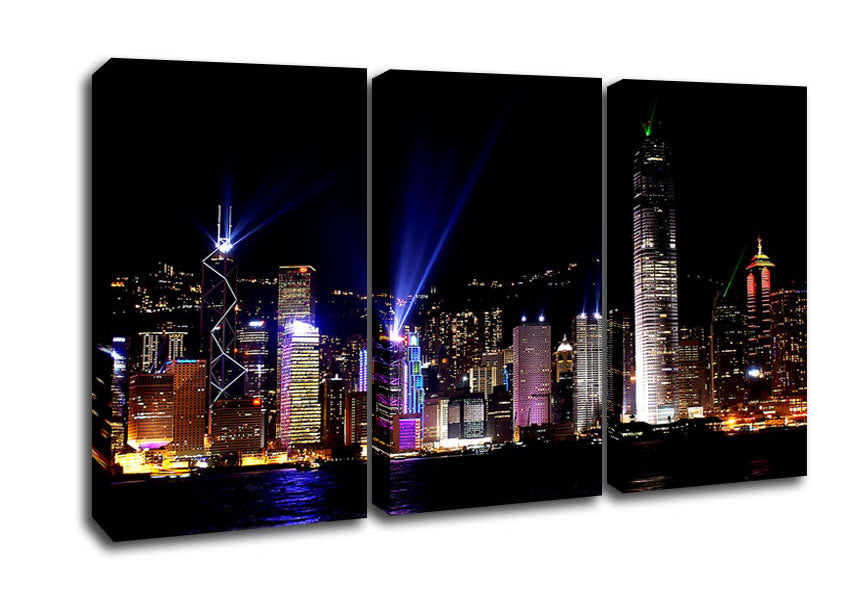 Hong Kong Skyline 3 Panel Canvas Print handmade in the UK. Stretched over a 2 inch thick wooden box frame, ready to hang on your wall.