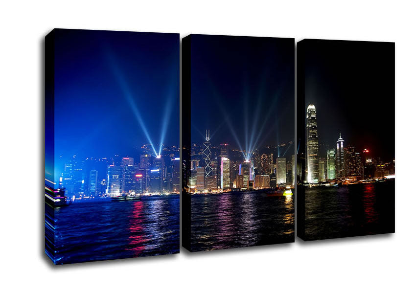 Hong Kong Strobe Light Reflections 3 Panel Canvas Print handmade in the UK. Stretched over a 2 inch thick wooden box frame, ready to hang on your wall.