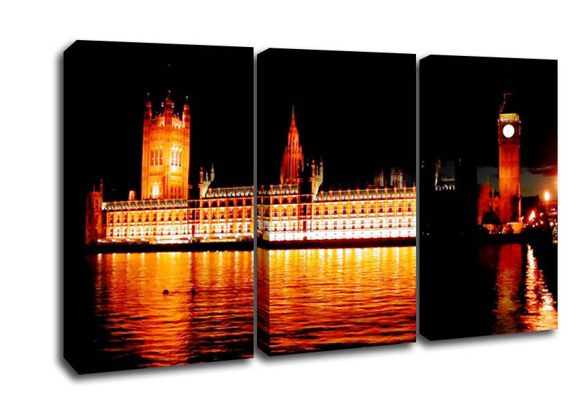 Houses Of Parliament Glow 3 Panel Canvas Print handmade in the UK. Stretched over a 2 inch thick wooden box frame, ready to hang on your wall.