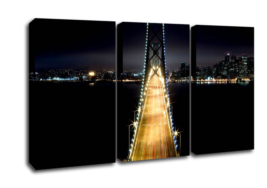 Lights on Bay Bridge 3 Panel Canvas Print handmade in the UK. Stretched over a 2 inch thick wooden box frame, ready to hang on your wall.