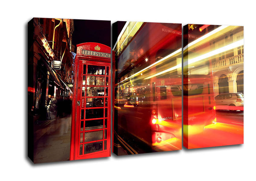 London Red Night Bus Blur 3 Panel Canvas Print handmade in the UK. Stretched over a 2 inch thick wooden box frame, ready to hang on your wall.