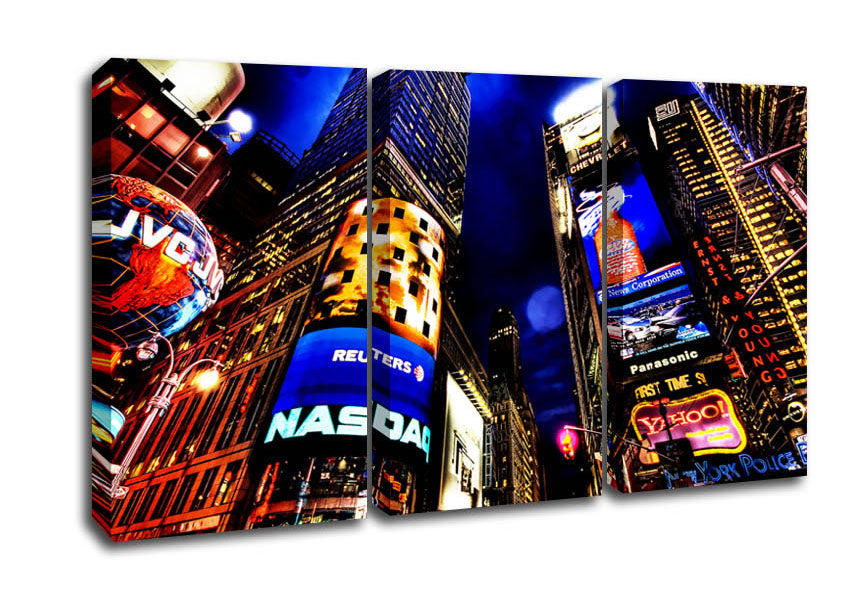 NYC Times Square Lights 3 Panel Canvas Print handmade in the UK. Stretched over a 2 inch thick wooden box frame, ready to hang on your wall.