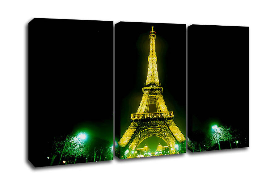 Paris Eiffel Tower Parade 3 Panel Canvas Print handmade in the UK. Stretched over a 2 inch thick wooden box frame, ready to hang on your wall.