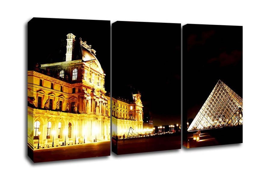 Paris Louvre Lights 3 Panel Canvas Print handmade in the UK. Stretched over a 2 inch thick wooden box frame, ready to hang on your wall.