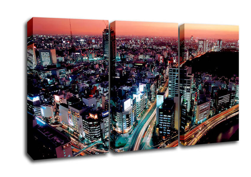 Rush Hour Through The City 3 Panel Canvas Print handmade in the UK. Stretched over a 2 inch thick wooden box frame, ready to hang on your wall.
