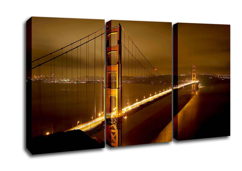 San Francisco Bridge Golden Mist 3 Panel Canvas Print handmade in the UK. Stretched over a 2 inch thick wooden box frame, ready to hang on your wall.