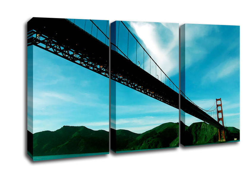 San Francisco Golden Gate Bridge Blue View 3 Panel Canvas Print handmade in the UK. Stretched over a 2 inch thick wooden box frame, ready to hang on your wall.