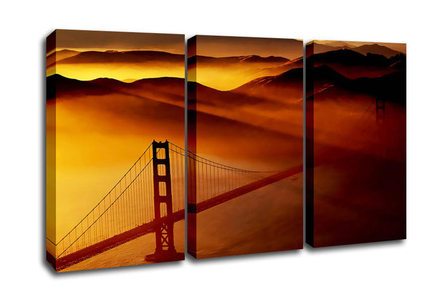 San Francisco Golden Gate Bridge Morning Mist 3 Panel Canvas Print handmade in the UK. Stretched over a 2 inch thick wooden box frame, ready to hang on your wall.