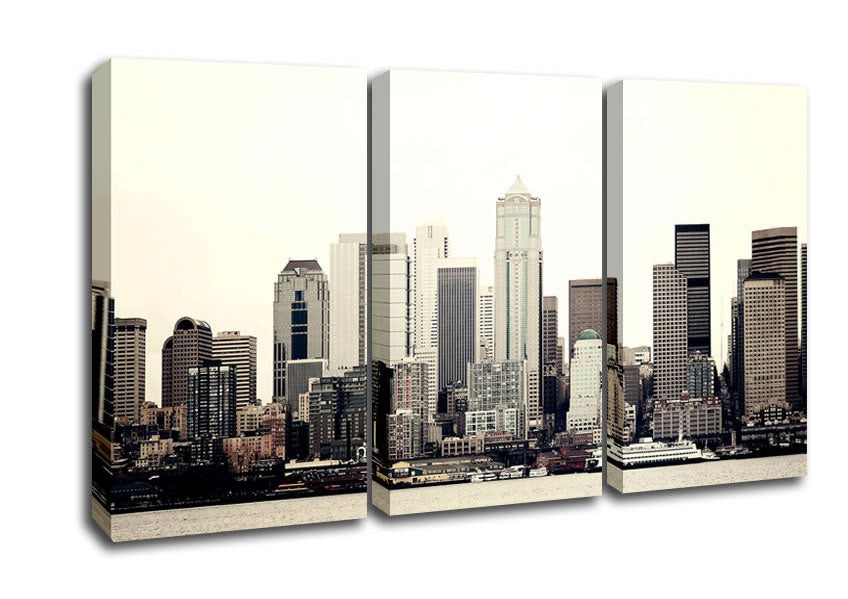 Seattle As Seen From Elliot Bay 3 Panel Canvas Print handmade in the UK. Stretched over a 2 inch thick wooden box frame, ready to hang on your wall.
