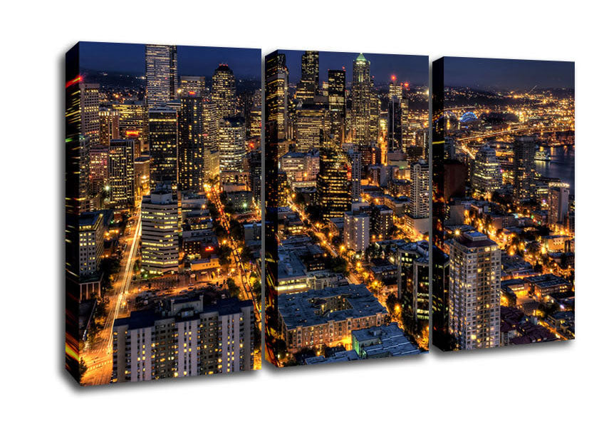 Seattle At Night From The Space Needle 3 Panel Canvas Print handmade in the UK. Stretched over a 2 inch thick wooden box frame, ready to hang on your wall.