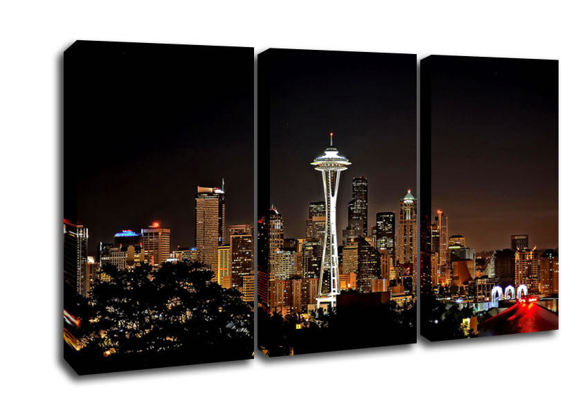 Spectacular Seattle 3 Panel Canvas Print handmade in the UK. Stretched over a 2 inch thick wooden box frame, ready to hang on your wall.