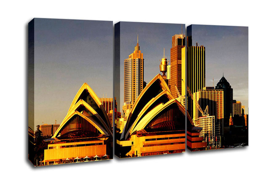 Sydney Opera House Golden Sunlight 3 Panel Canvas Print handmade in the UK. Stretched over a 2 inch thick wooden box frame, ready to hang on your wall.