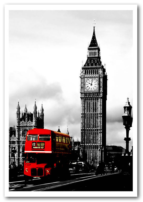 London Big Ben Red Bus B n W Poster printed on high quality canvas paper, ready to display.