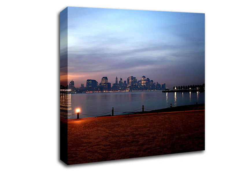 City Across The Water Square Canvas Print handmade in the UK. Stretched over a 2 inch thick wooden box frame, ready to hang on your wall.