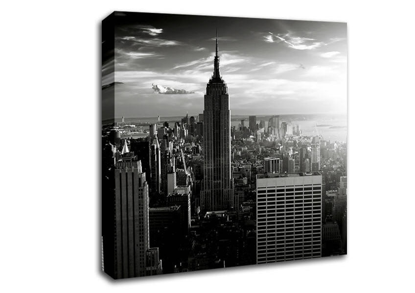 Empire State Building Sun Glow B n W Square Canvas Print handmade in the UK. Stretched over a 2 inch thick wooden box frame, ready to hang on your wall.