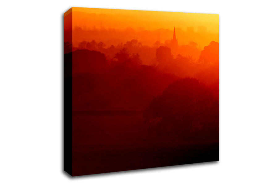English Countryside At Dawn Square Canvas Print handmade in the UK. Stretched over a 2 inch thick wooden box frame, ready to hang on your wall.