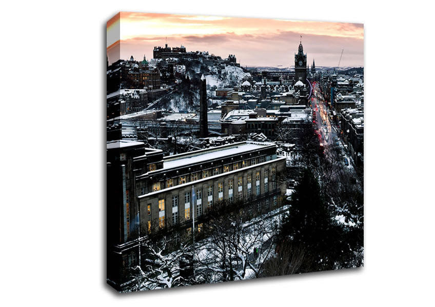 Evening In Edinburgh Square Canvas Print handmade in the UK. Stretched over a 2 inch thick wooden box frame, ready to hang on your wall.