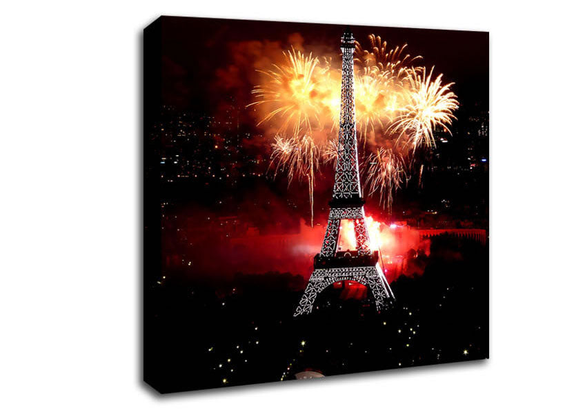 Fireworks Eiffel Tower Square Canvas Print handmade in the UK. Stretched over a 2 inch thick wooden box frame, ready to hang on your wall.
