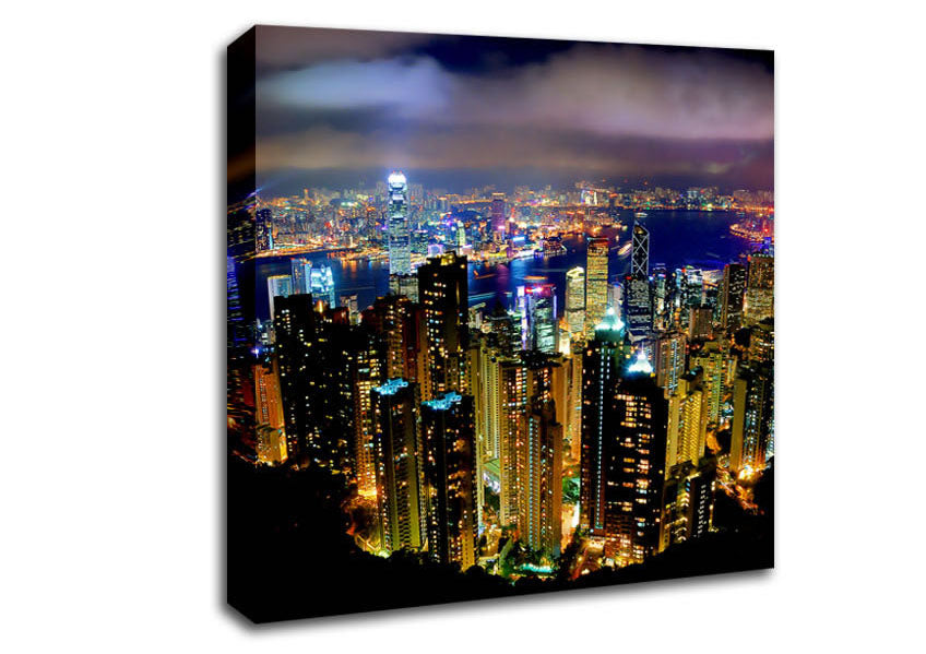 Hong Kong Night Light Square Canvas Print handmade in the UK. Stretched over a 2 inch thick wooden box frame, ready to hang on your wall.