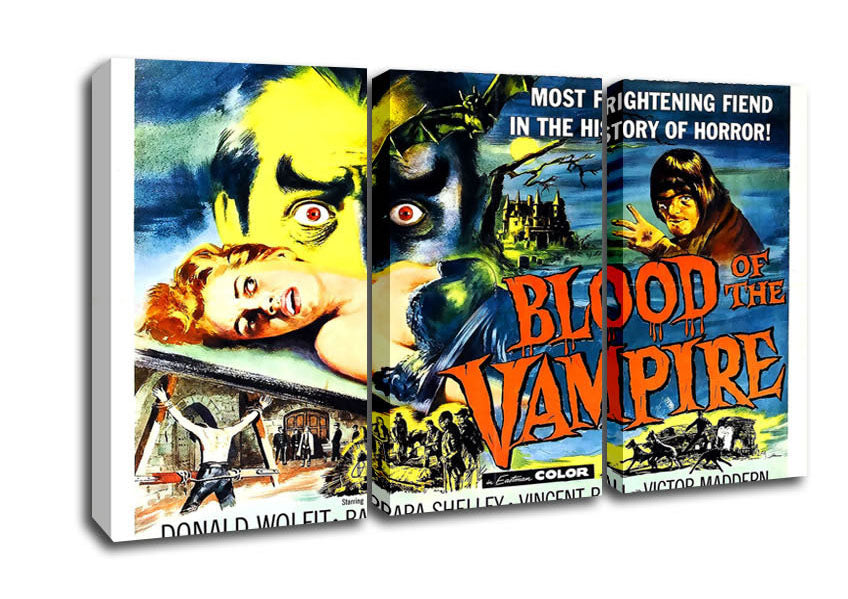 Blood Of The Vampire Poster 2 3 Panel Canvas Print handmade in the UK. Stretched over a 2 inch thick wooden box frame, ready to hang on your wall.