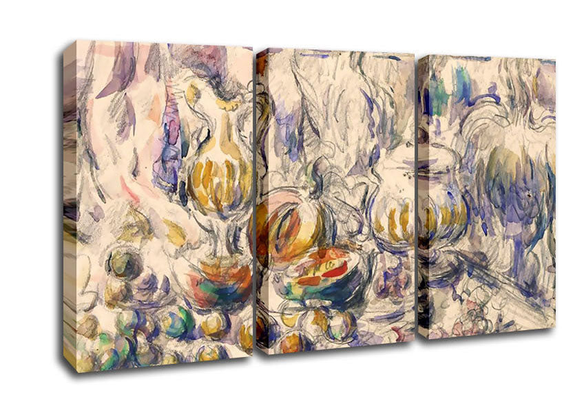 Cezanne Pot And Soup Tureen 3 Panel Canvas Print handmade in the UK. Stretched over a 2 inch thick wooden box frame, ready to hang on your wall.