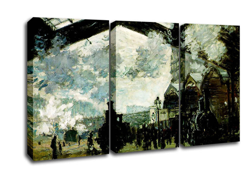 Claude Monet The Saint-Lazare Station 3 Panel Canvas Print handmade in the UK. Stretched over a 2 inch thick wooden box frame, ready to hang on your wall.