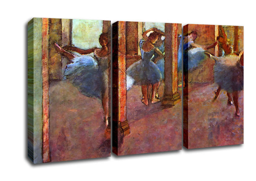 Degas Dancers In The Foyer 3 Panel Canvas Print handmade in the UK. Stretched over a 2 inch thick wooden box frame, ready to hang on your wall.
