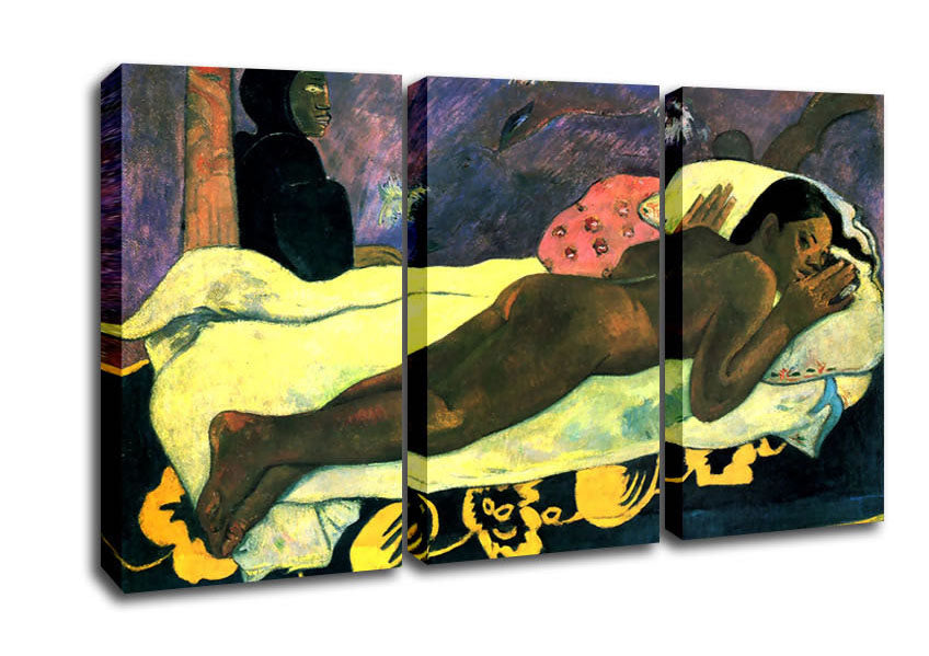 Gauguin Manao Tupapau 3 Panel Canvas Print handmade in the UK. Stretched over a 2 inch thick wooden box frame, ready to hang on your wall.