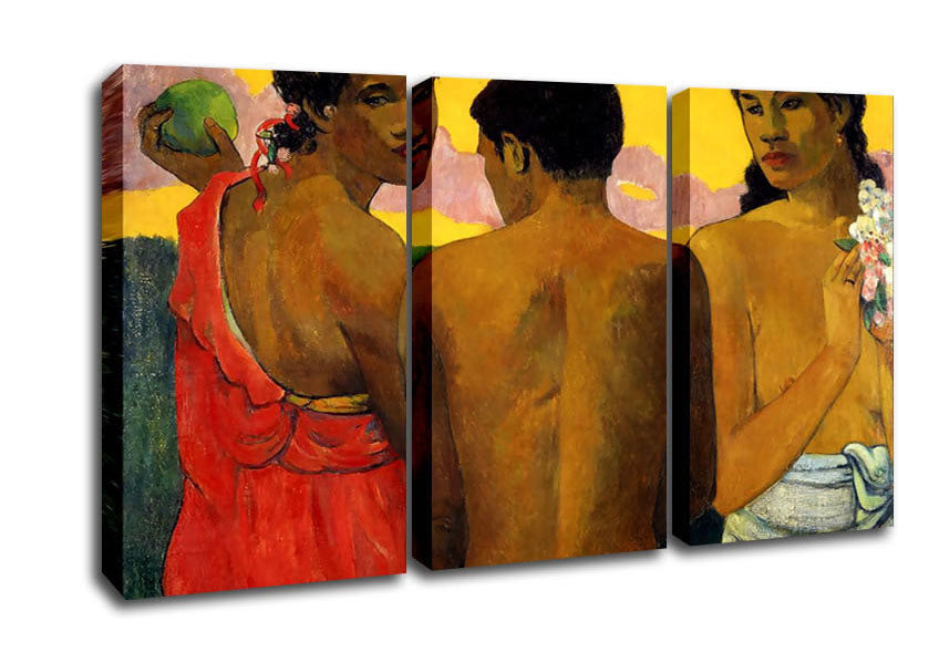 Gauguin Three Tahitians 3 Panel Canvas Print handmade in the UK. Stretched over a 2 inch thick wooden box frame, ready to hang on your wall.