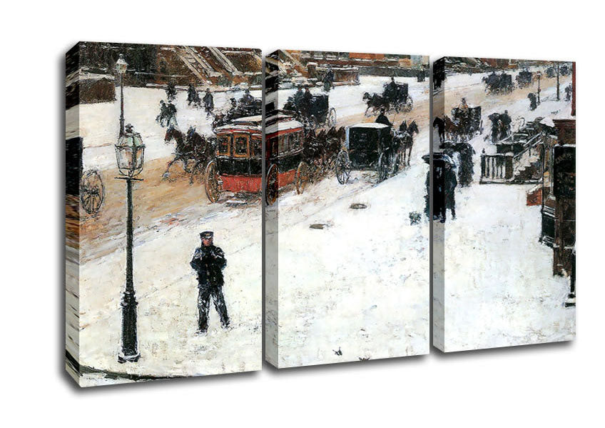 Hassam Fifth Avenue In Winter 3 Panel Canvas Print handmade in the UK. Stretched over a 2 inch thick wooden box frame, ready to hang on your wall.