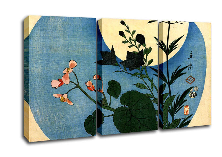 Hiroshige Autumn Flowers With Full Moon 3 Panel Canvas Print handmade in the UK. Stretched over a 2 inch thick wooden box frame, ready to hang on your wall.