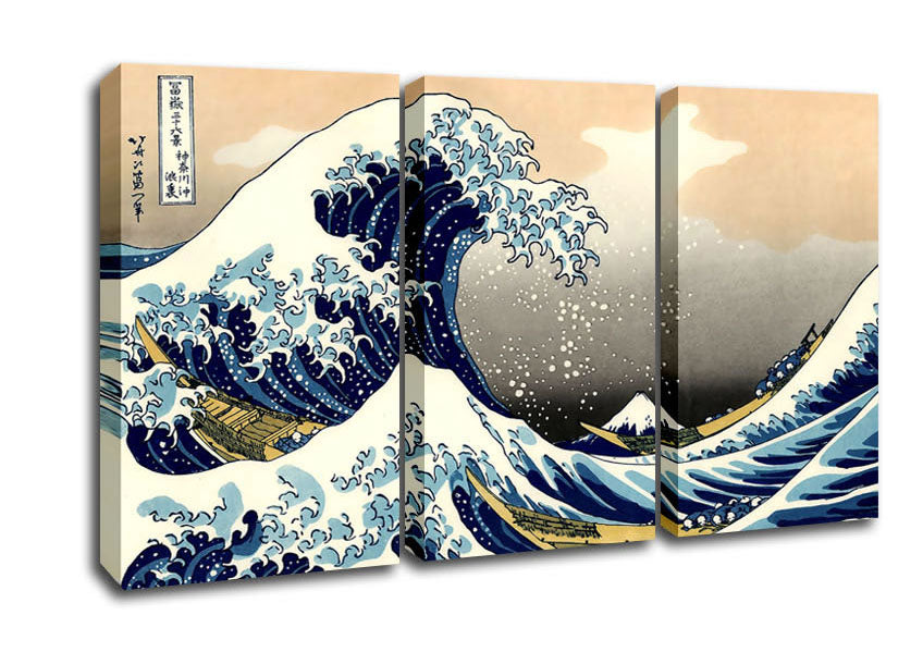 Hokusai A Big Wave Off Kanagawa 3 Panel Canvas Print handmade in the UK. Stretched over a 2 inch thick wooden box frame, ready to hang on your wall.
