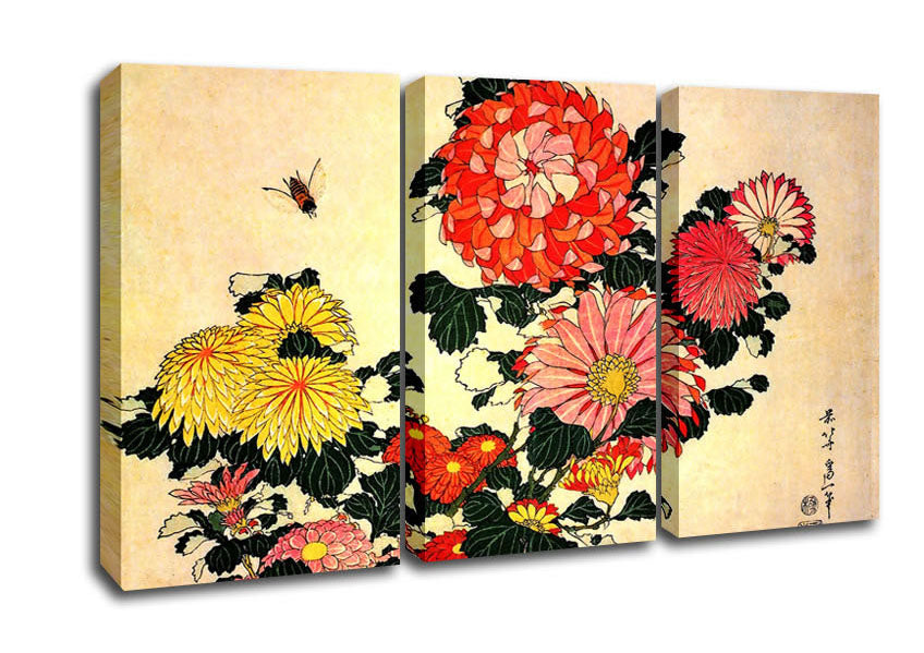 Hokusai Chrysanthemum And Bee 3 Panel Canvas Print handmade in the UK. Stretched over a 2 inch thick wooden box frame, ready to hang on your wall.