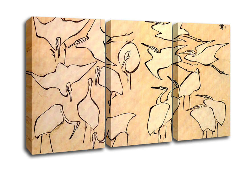 Hokusai Cranes 3 Panel Canvas Print handmade in the UK. Stretched over a 2 inch thick wooden box frame, ready to hang on your wall.