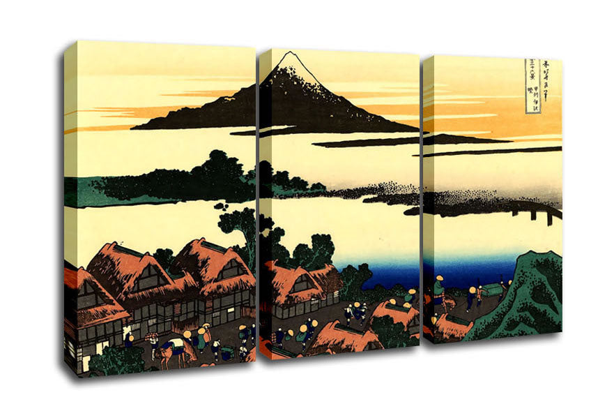 Hokusai Dawn At Isawa In The Kai Province 3 Panel Canvas Print handmade in the UK. Stretched over a 2 inch thick wooden box frame, ready to hang on your wall.