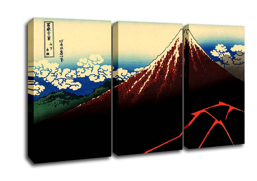 Hokusai Lightning Below The Summit 3 Panel Canvas Print handmade in the UK. Stretched over a 2 inch thick wooden box frame, ready to hang on your wall.