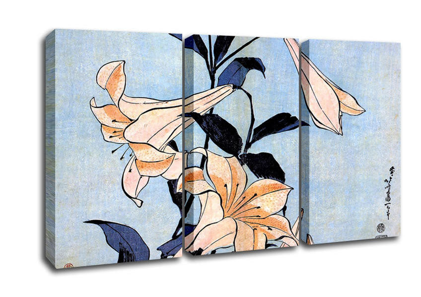 Hokusai Lilies 3 Panel Canvas Print handmade in the UK. Stretched over a 2 inch thick wooden box frame, ready to hang on your wall.