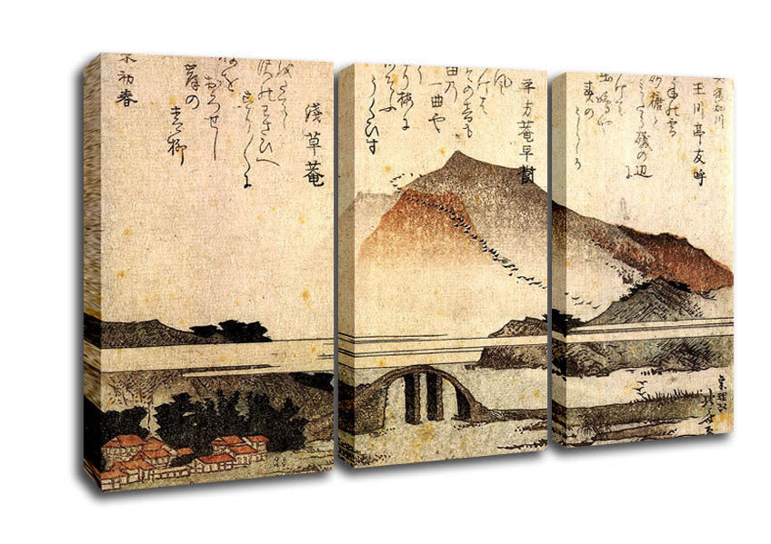 Hokusai Mountain Landscape With A Bridge 3 Panel Canvas Print handmade in the UK. Stretched over a 2 inch thick wooden box frame, ready to hang on your wall.
