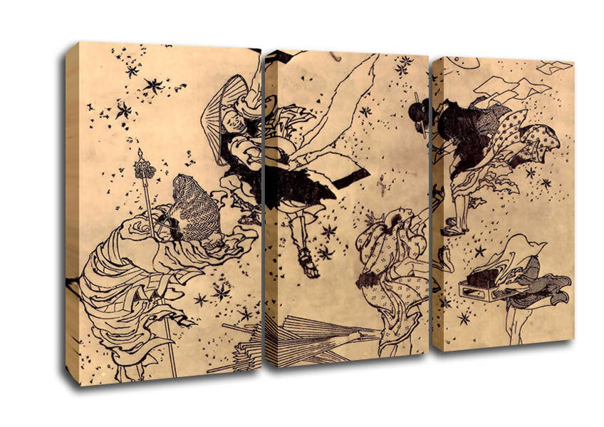 Hokusai Sudden Wind 3 Panel Canvas Print handmade in the UK. Stretched over a 2 inch thick wooden box frame, ready to hang on your wall.