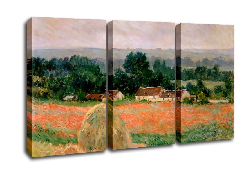 Monet Haystacks At Giverny 3 Panel Canvas Print handmade in the UK. Stretched over a 2 inch thick wooden box frame, ready to hang on your wall.