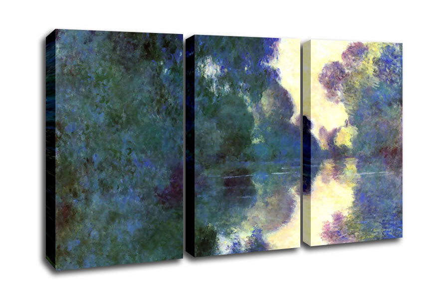 Monet Morning On The Seine At Giverny 3 Panel Canvas Print handmade in the UK. Stretched over a 2 inch thick wooden box frame, ready to hang on your wall.