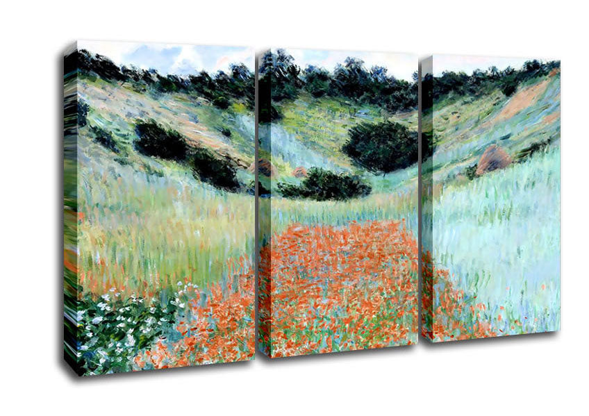 Monet Poppy Field Near Giverny 3 Panel Canvas Print handmade in the UK. Stretched over a 2 inch thick wooden box frame, ready to hang on your wall.