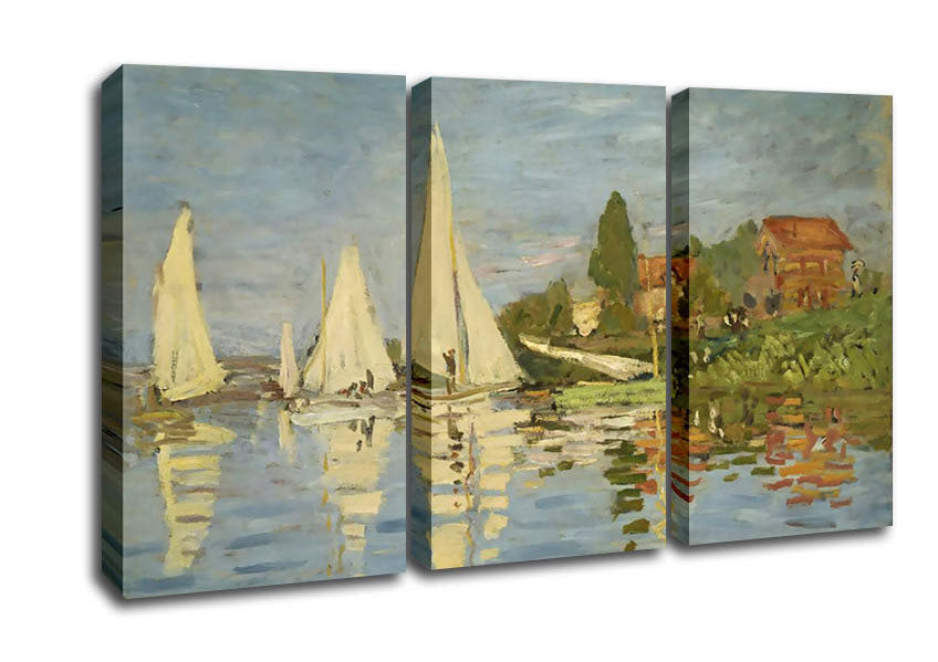 Monet Regattas At Argenteuil 3 Panel Canvas Print handmade in the UK. Stretched over a 2 inch thick wooden box frame, ready to hang on your wall.